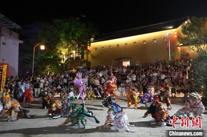 涌動的人群跟隨著花神魚燈巡游隊伍,浩浩蕩蕩地穿越古村落和土樓群——在古村落戲臺前遇見非遺滾燈、在親水平臺看見焰火瀑布與聆聽國風樂隊的動情音樂、在人民會場前參與高山族喝福酒互動,還有高山族熱情篝火拉手舞、拋繡球和神秘的變臉大師……