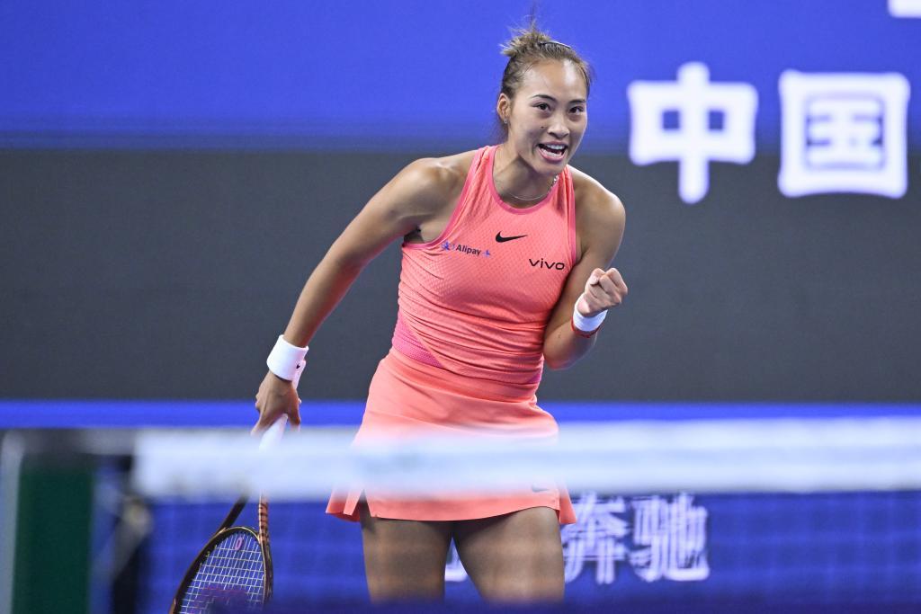 10月2日,鄭欽文在賽后慶祝勝利。新華社記者 張龍 攝