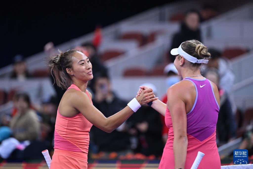10月2日,鄭欽文(左)在賽后與阿尼西莫娃握手致意。
