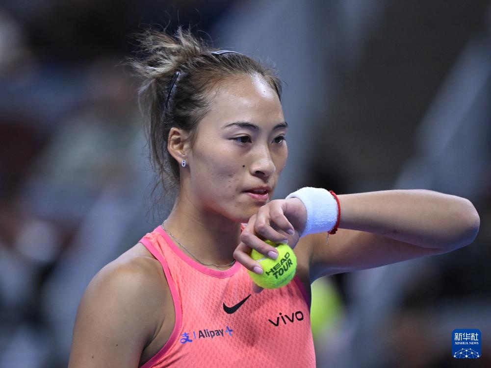 10月2日,鄭欽文在比賽中向?qū)κ质疽狻?/p>