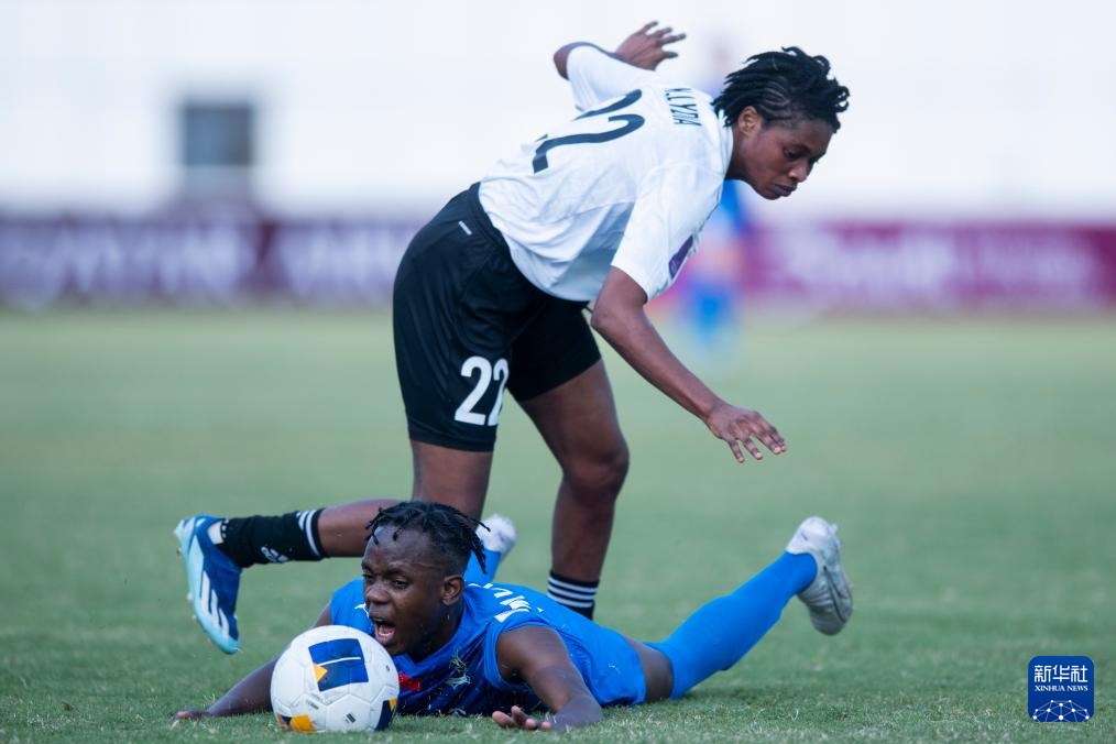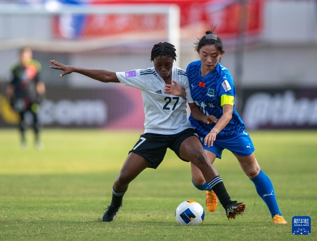 10月3日,武漢車谷江大隊球員薩拉圖·特拉奧雷(左)與阿布扎比鄉村俱樂部隊球員法蒂瑪在比賽中拼搶。