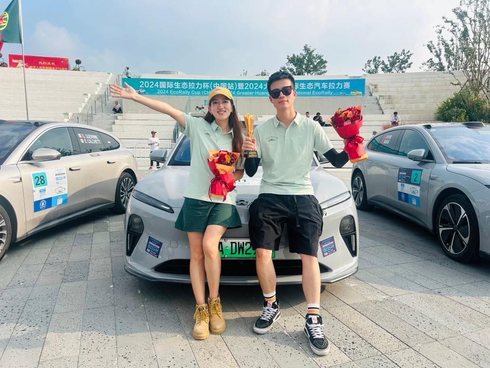 ↑獲得最佳駕駛技術獎第三名的談兢娣(左一)與搭檔合影。新華社記者 周暢 攝
