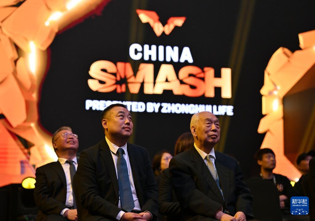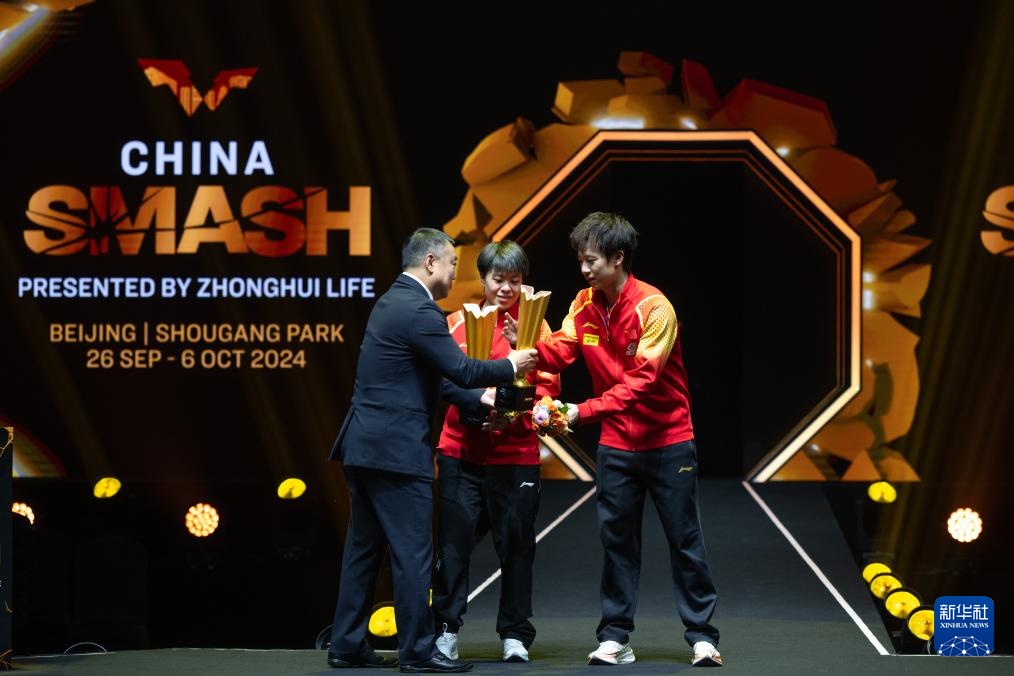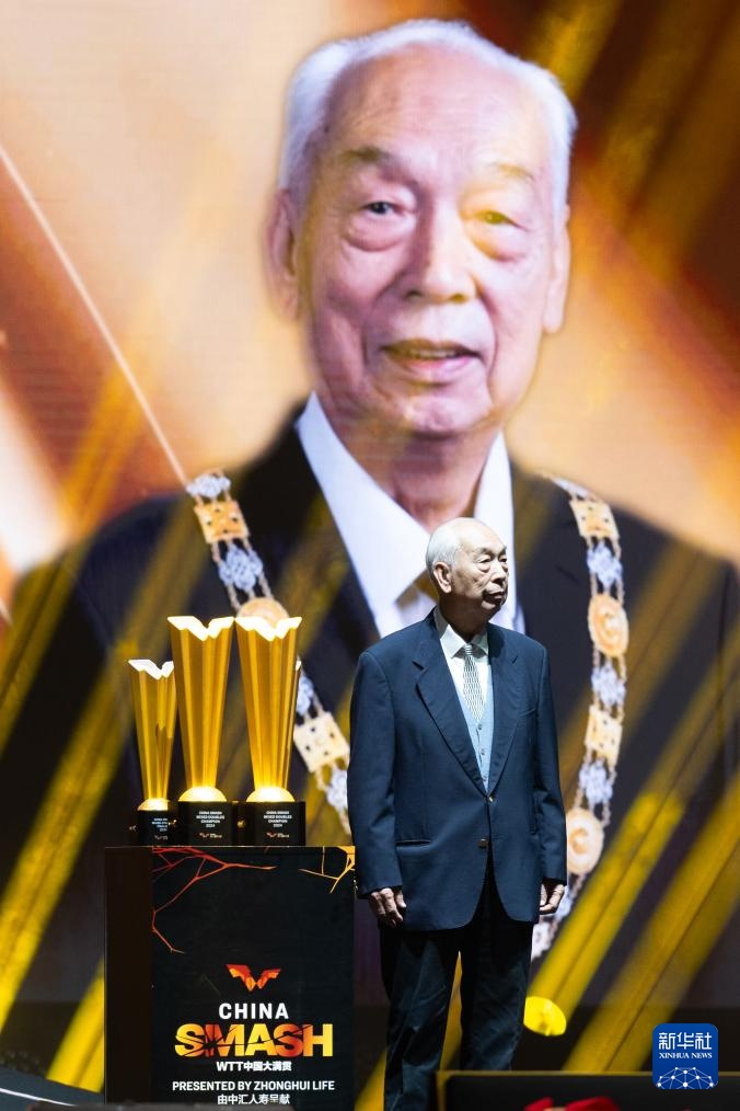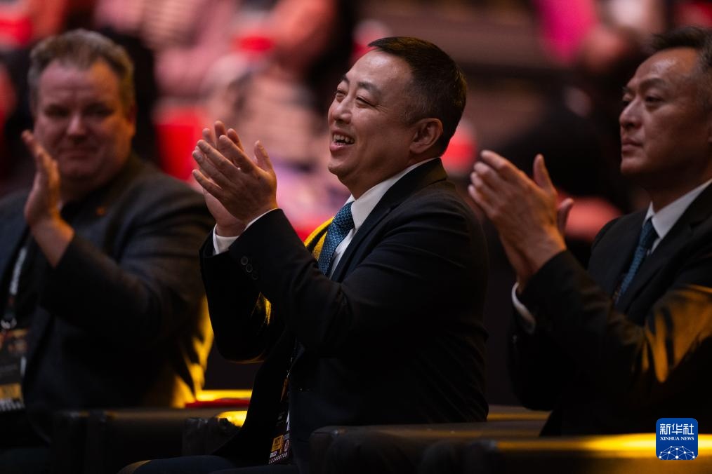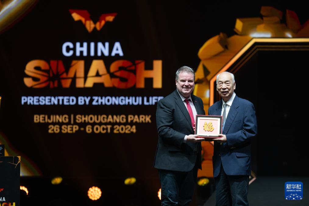 10月4日,國際乒聯集團首席執行官、世界乒乓球職業大聯盟(WTT)董事史蒂夫·丹頓向“體育工作杰出貢獻者”國家榮譽稱號獲得者張燮林(右)贈送紀念品。