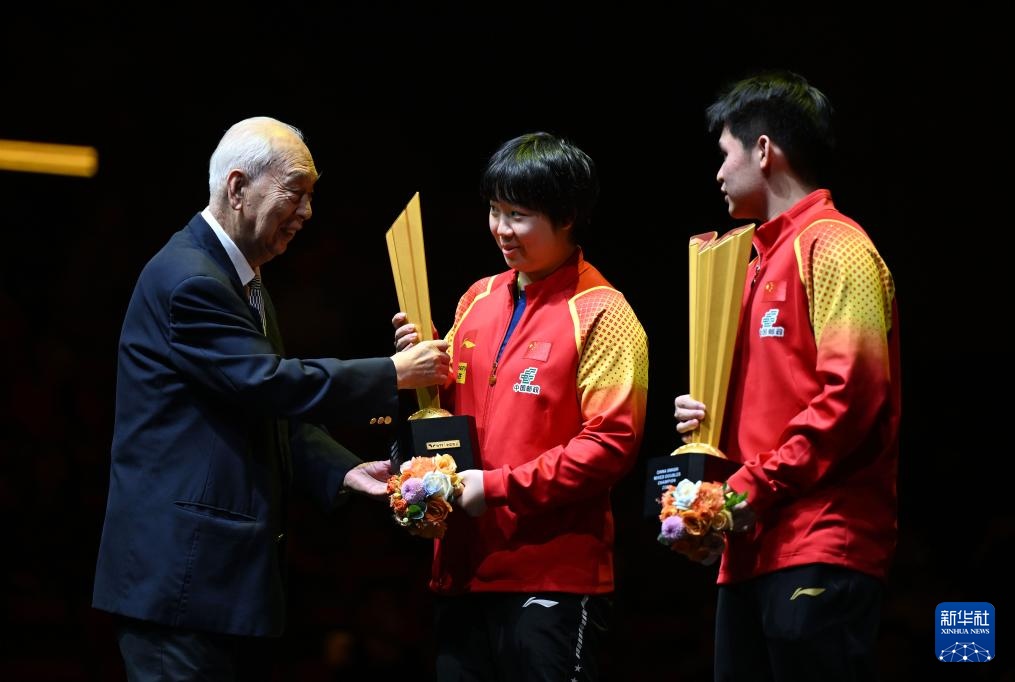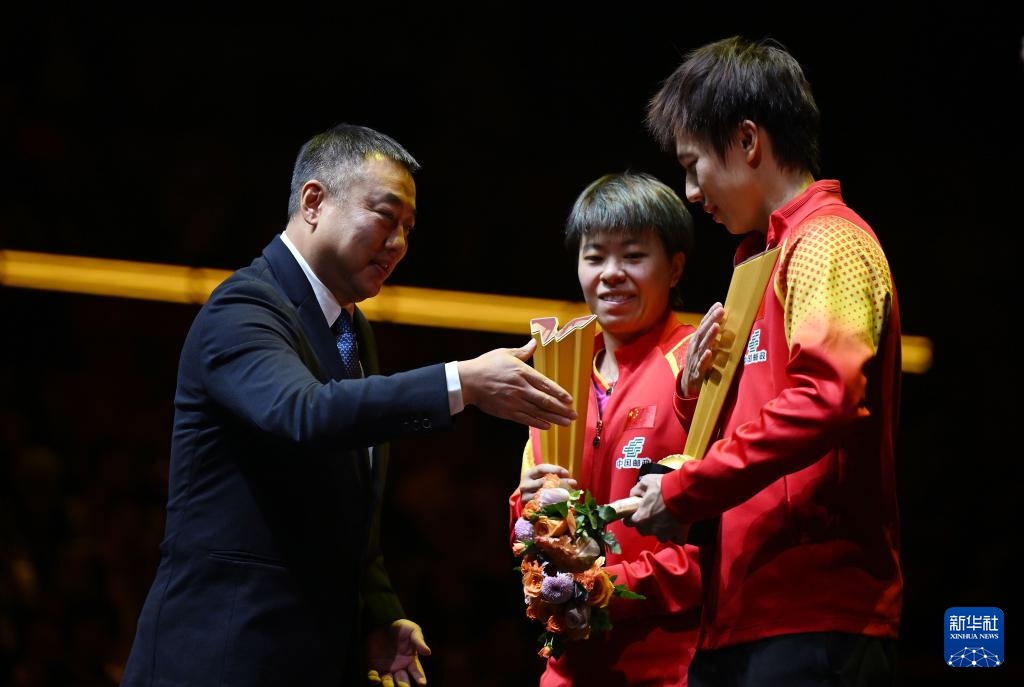10月4日,中國乒協主席劉國梁(左)在頒獎儀式上為林高遠(右)/王藝迪頒發混雙亞軍獎杯。