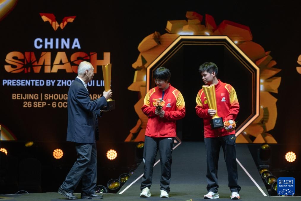 10月4日,中國乒協主席劉國梁為亞軍林高遠(右)/王藝迪頒獎。
