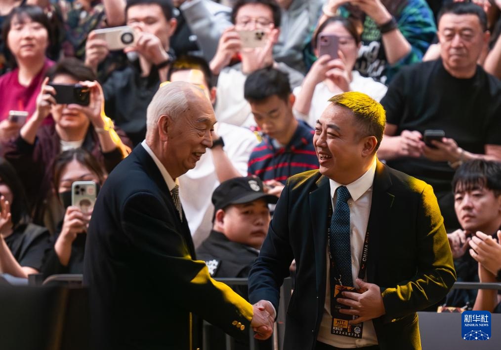 10月4日,中國乒協主席劉國梁在比賽間隙與“體育工作杰出貢獻者”國家榮譽稱號獲得者張燮林(左)握手致意。