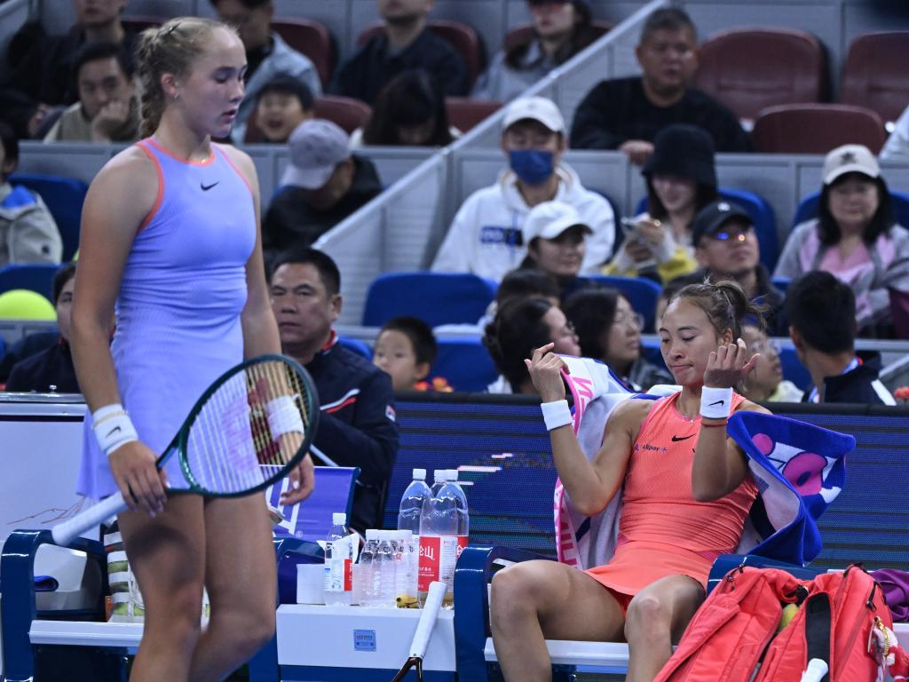 10月4日,鄭欽文(右)與安德烈耶娃在比賽間隙。新華社記者 張龍 攝
