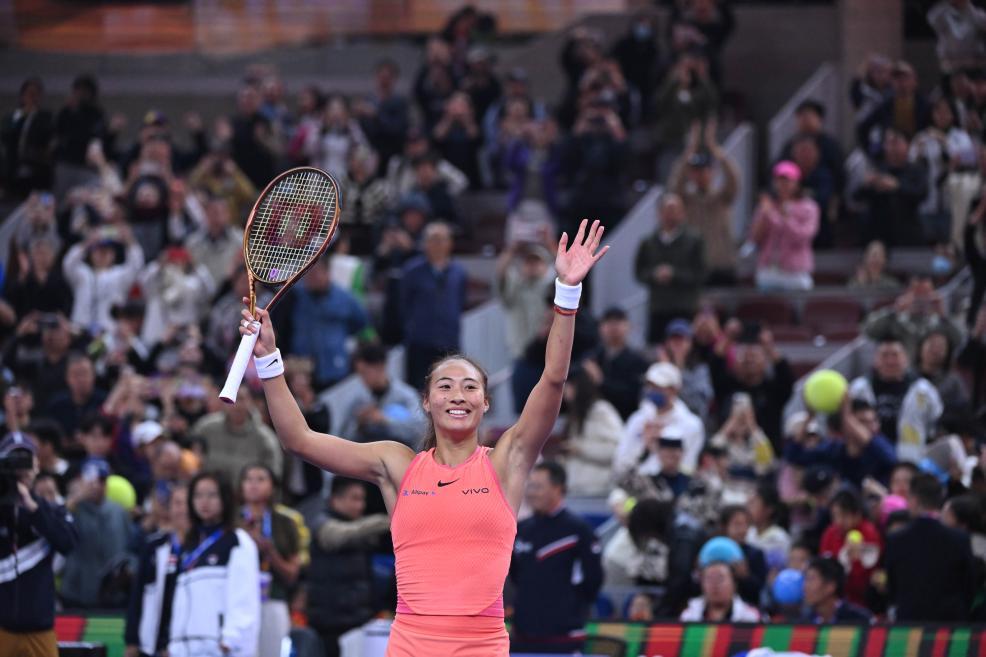 10月4日,鄭欽文在賽后慶祝勝利。新華社記者 張龍 攝