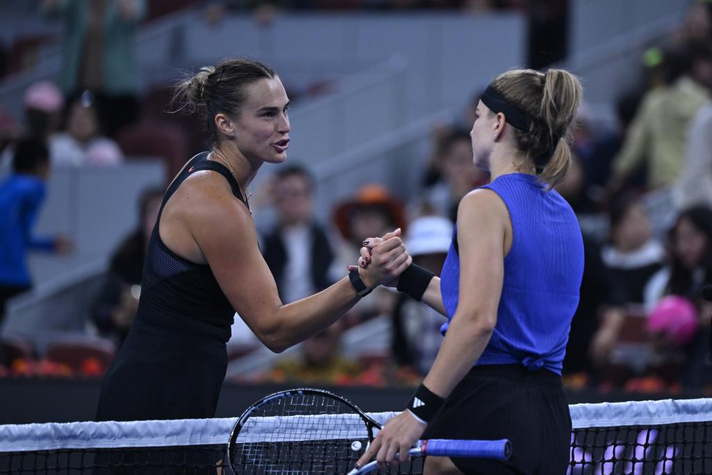 10月4日,薩巴倫卡(左)與穆霍娃在賽后握手致意。新華社記者 張龍 攝