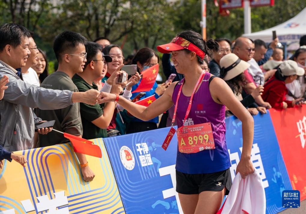 10月5日,馬拉松女子組冠軍楊定榮在比賽后與場邊觀眾互動(dòng)。