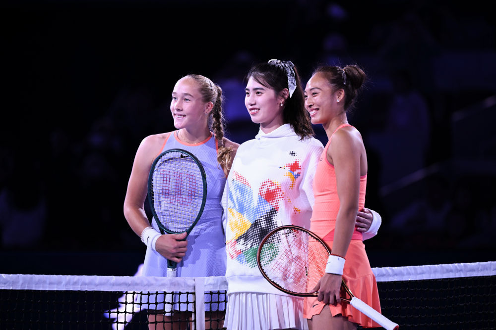 2024年10月4日,中國選手鄭欽文(右)、俄羅斯選手米拉·安德烈耶娃(左)與開球嘉賓、游泳運動員張雨霏在2024中國網球公開賽女單四分之一決賽前合影。 新華社記者 張龍 攝