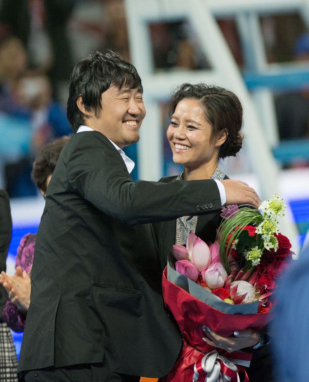 2014年9月30日 ,兩屆網球大滿貫賽事冠軍得主李娜在退役儀式上與丈夫姜山擁抱。李娜的退役儀式在2014年中國網球公開賽的中央球場鉆石球場舉行。 新華社記者張宇攝