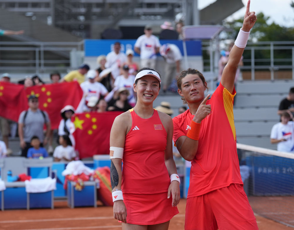 2024年8月1日,中國組合王欣瑜(左)/張之臻在巴黎奧運會網球混合雙打半決賽后慶祝。 新華社記者 萬象 攝