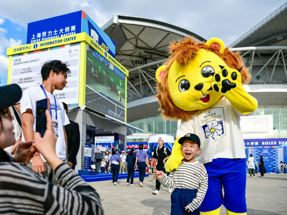 2024年10月3日,觀眾在上海旗忠網球中心與2024年上海勞力士大師賽吉祥物“大獅”合影。 新華社記者 王翔 攝
