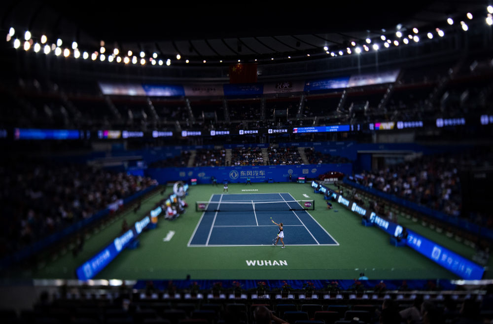 2019年9月25日,捷克選手科維托娃(前)與美國選手斯蒂芬斯在2019年WTA武漢網球公開賽女子單打第三輪比賽中。新華社記者肖藝九攝