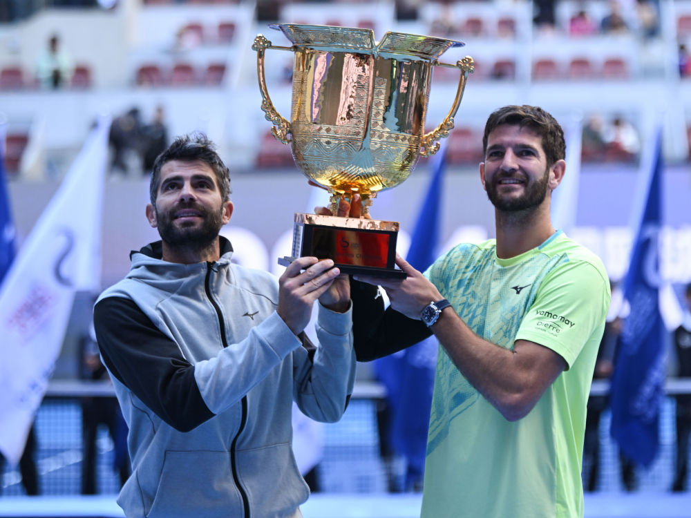 2024年10月2日,男子雙打冠軍、意大利組合伯萊里/瓦瓦索里(右)在2024中國網球公開賽頒獎儀式上合影。新華社記者 張龍 攝