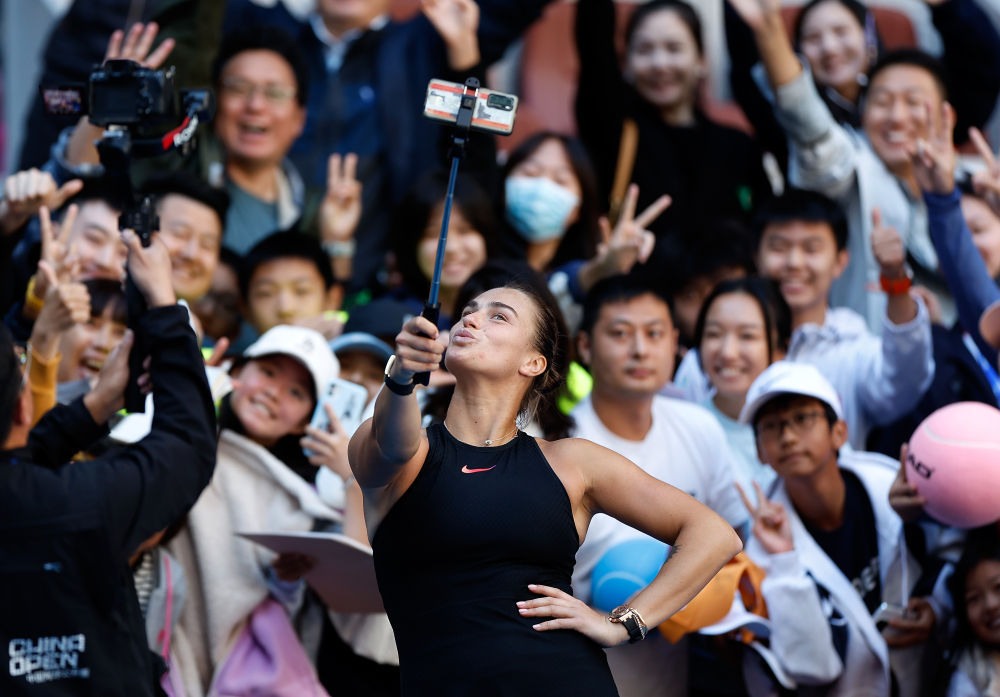 2024年10月2日,白俄羅斯選手薩巴倫卡在2024中國網球公開賽女單第四輪比賽后與觀眾自拍。 新華社記者 王麗莉 攝