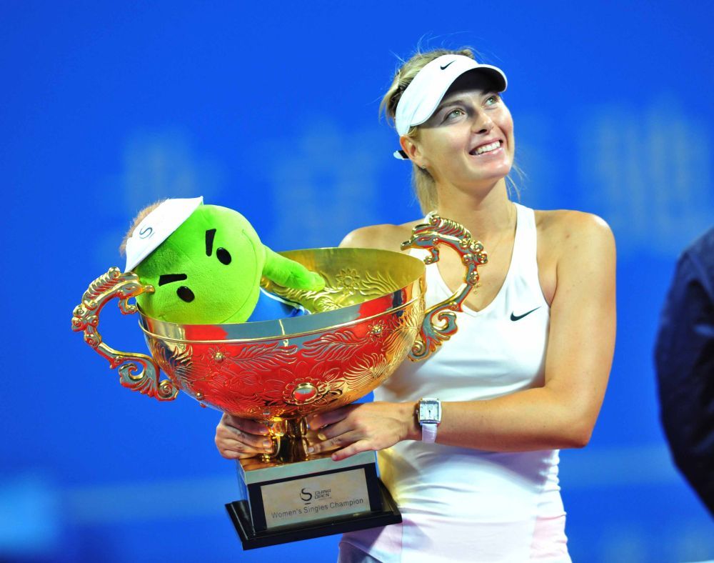 2014年10月5日,女子單打冠軍、俄羅斯選手莎拉波娃在2014中國網球公開賽頒獎儀式上展示獎杯。新華社記者李文攝