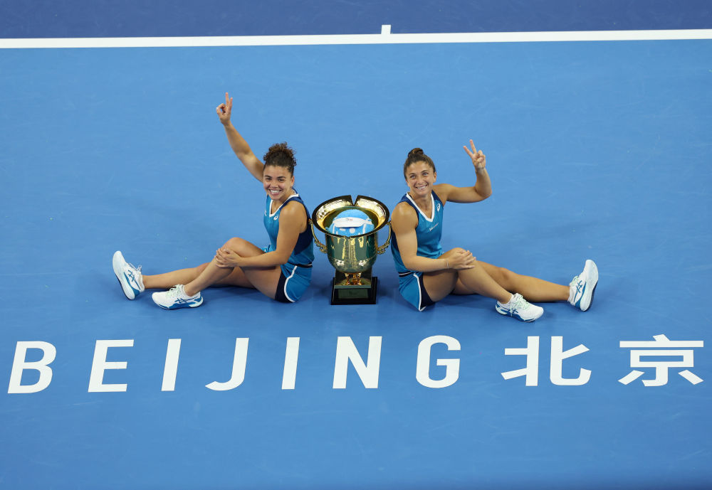 2024年10月6日,女子雙打冠軍意大利組合埃拉尼(右)/保利尼在2024中國網球公開賽頒獎儀式上合影。 新華社記者 張龍 攝
