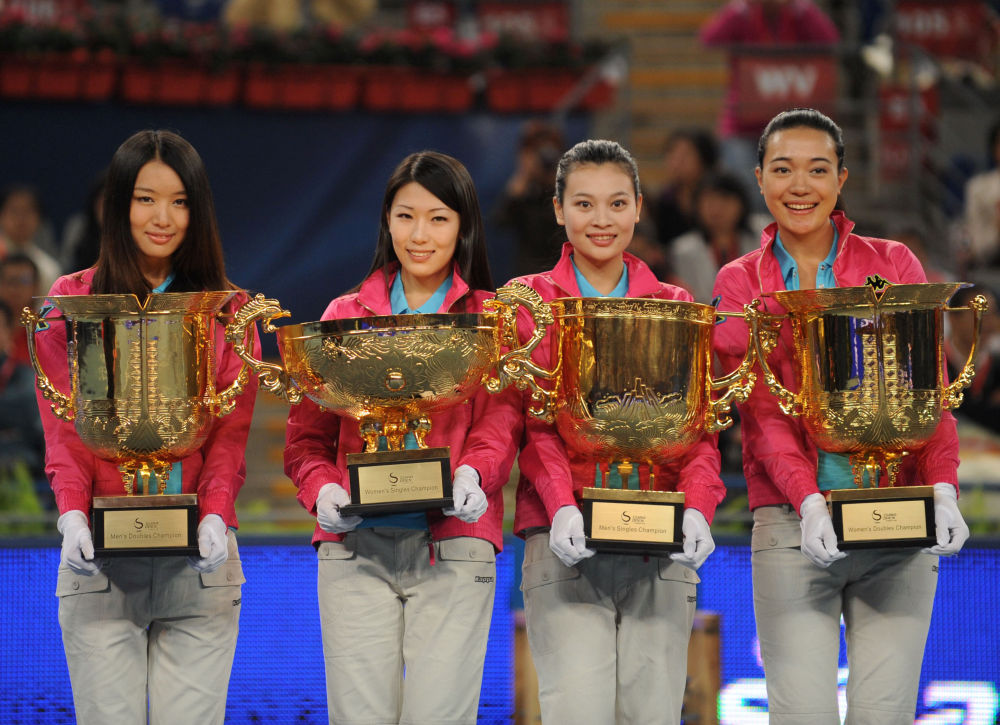 2009年10月7日,模特在中央球場展示全新的中網獎杯,從左至右分別是男雙、女單、男單、女雙冠軍獎杯。其中,男單冠軍獎杯設計靈感來自于故宮博物院的館藏珍品“金甌永固杯”。女單冠軍獎杯造型取自國家博物館重器“子龍鼎”。新華社記者羅曉光攝