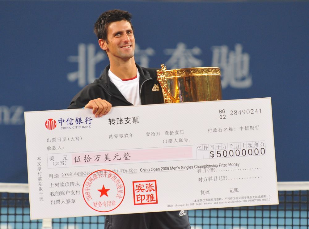 2009年10月11日,男子單打冠軍塞爾維亞選手焦科維奇在2009中國網球公開賽頒獎儀式上慶祝。截至2024年,焦科維奇獲得六次中網男單冠軍。新華社記者羅曉光攝