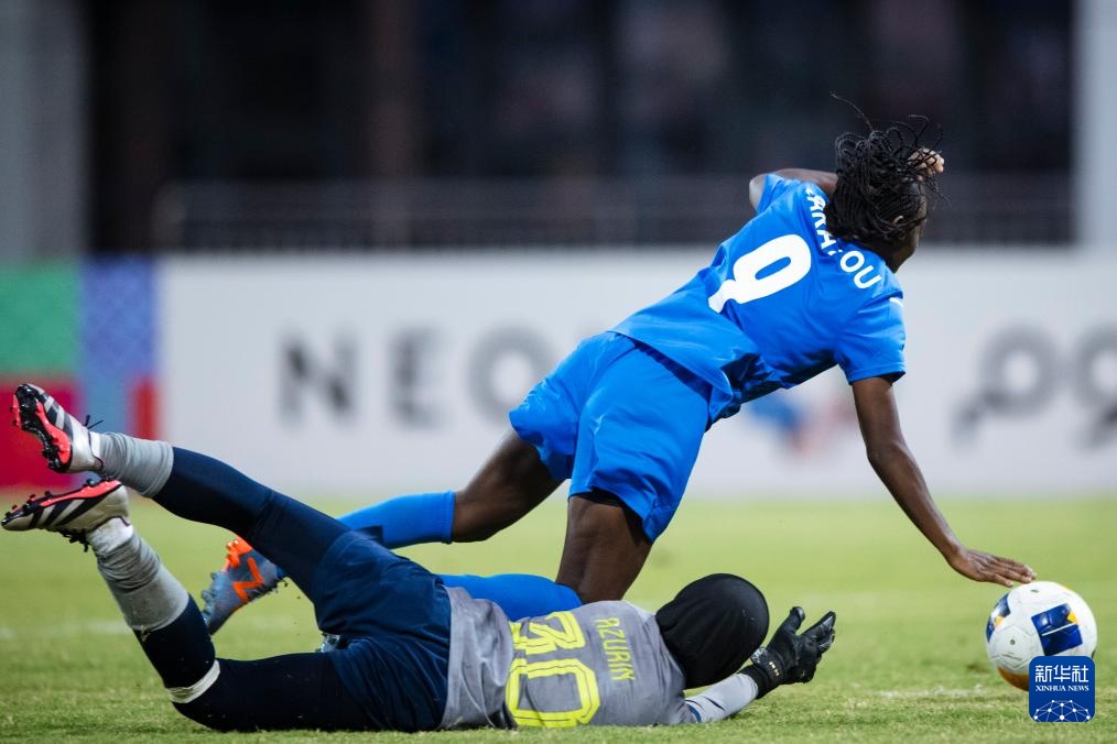 10月6日,武漢車谷江大隊(duì)球員薩拉圖·特勞雷(上)在比賽中帶球突破時(shí)摔倒。