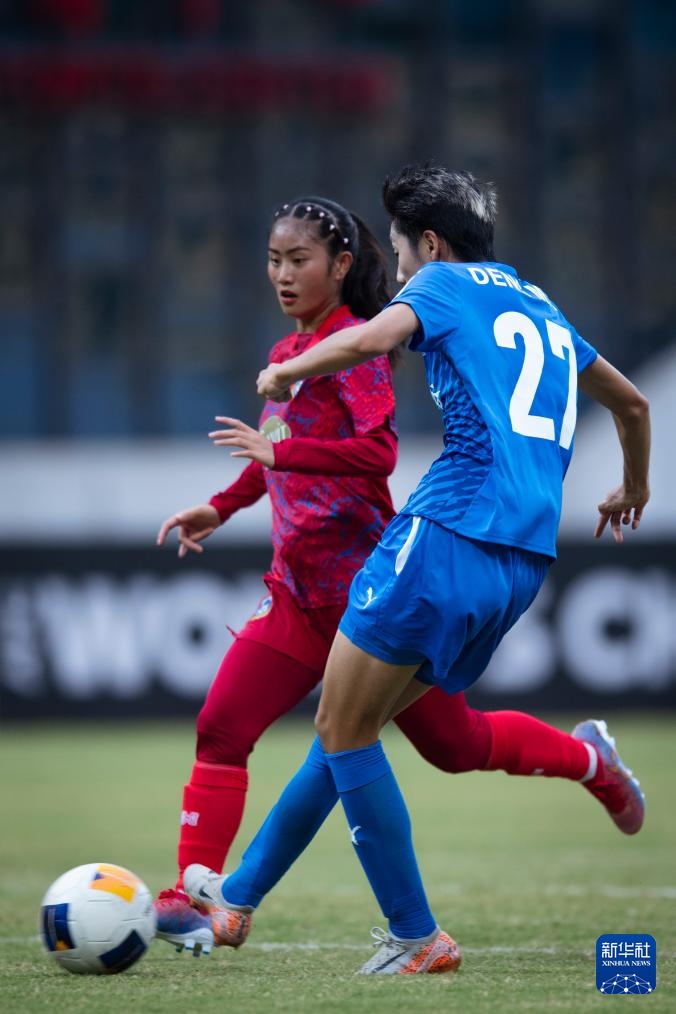 10月6日,武漢車谷江大隊(duì)球員鄧夢(mèng)曄(右)在比賽中射門得分。