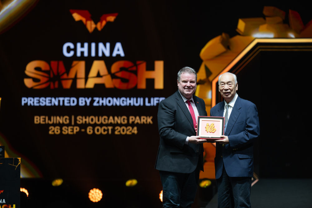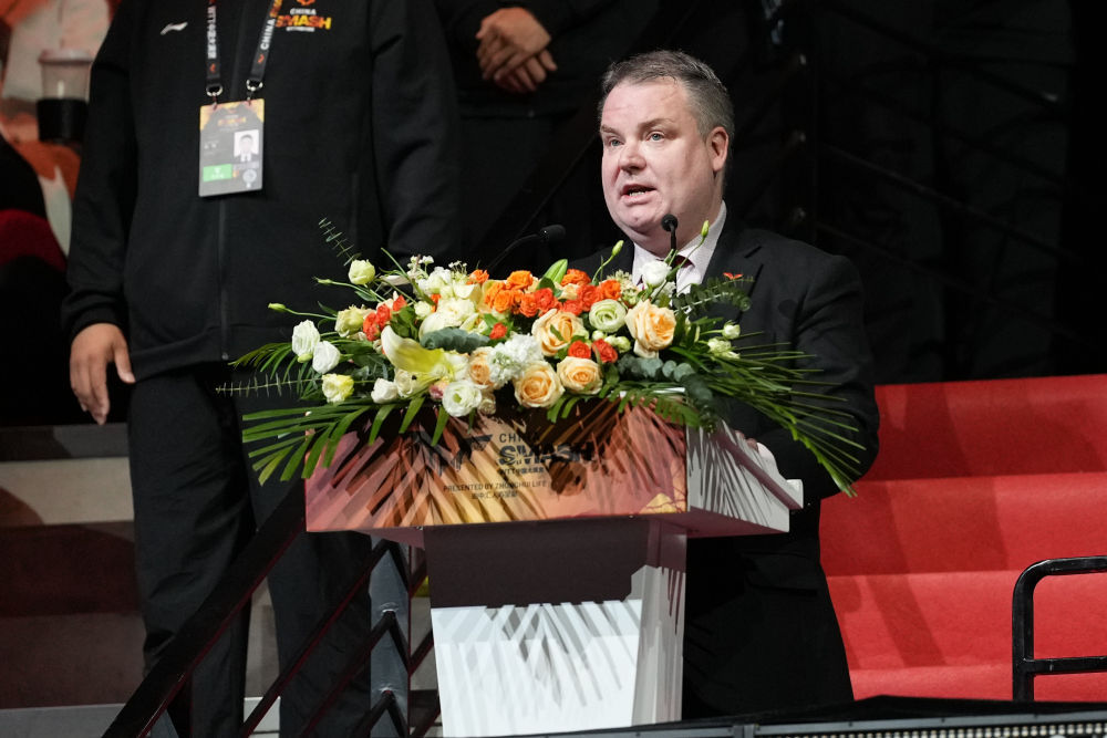 9月29日,史蒂夫·丹頓在2024年世界乒乓球職業大聯盟(WTT)中國大滿貫賽開幕式上致辭。新華社記者 鞠煥宗 攝