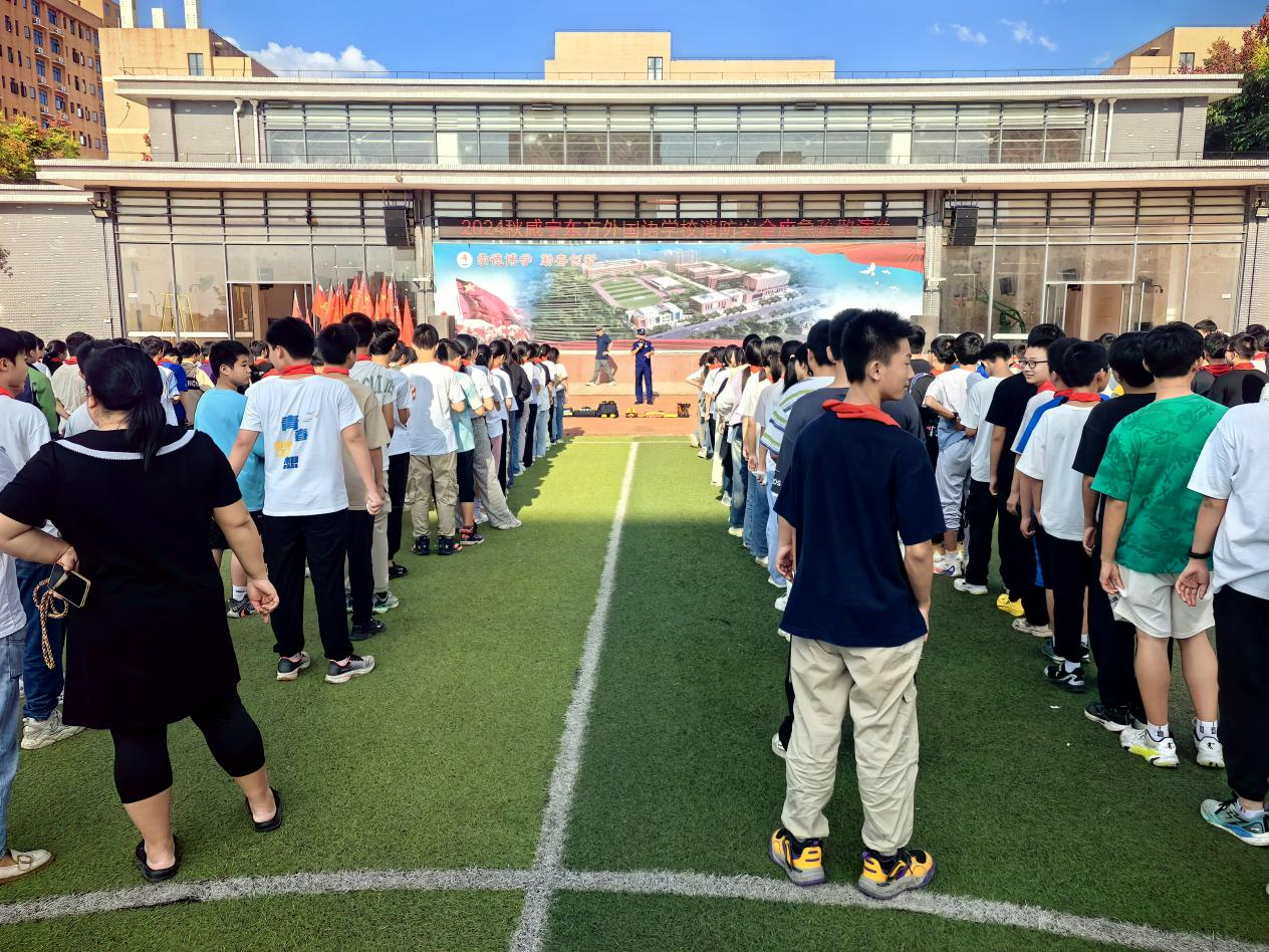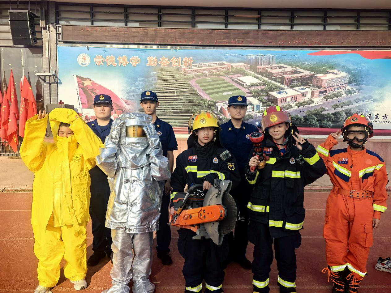 在操場上,消防救援人員為在場師生展示了滅火服裝、無齒鋸等消防裝備器材,講解了滅火器的正確操作方法,并邀請同學們上前體驗穿消防服裝,使用滅火器撲滅油盆火災,同學們都紛紛踴躍參與,達到了消防安全入腦入心的良好效果。