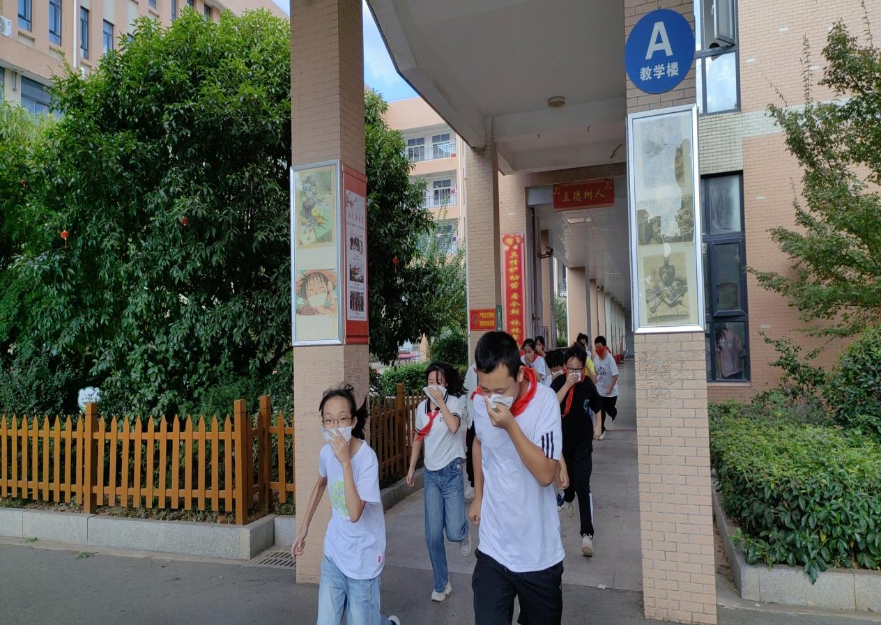 隨著一陣急促的警報聲,學校的師生們按照既定程序開展校園消防疏散演練。全體師生井然有序,彎腰低姿、捂住口鼻,快速沿樓梯撤離,經過近5分鐘的疏散,所有人員均安全抵達學校操場上的安全區域。