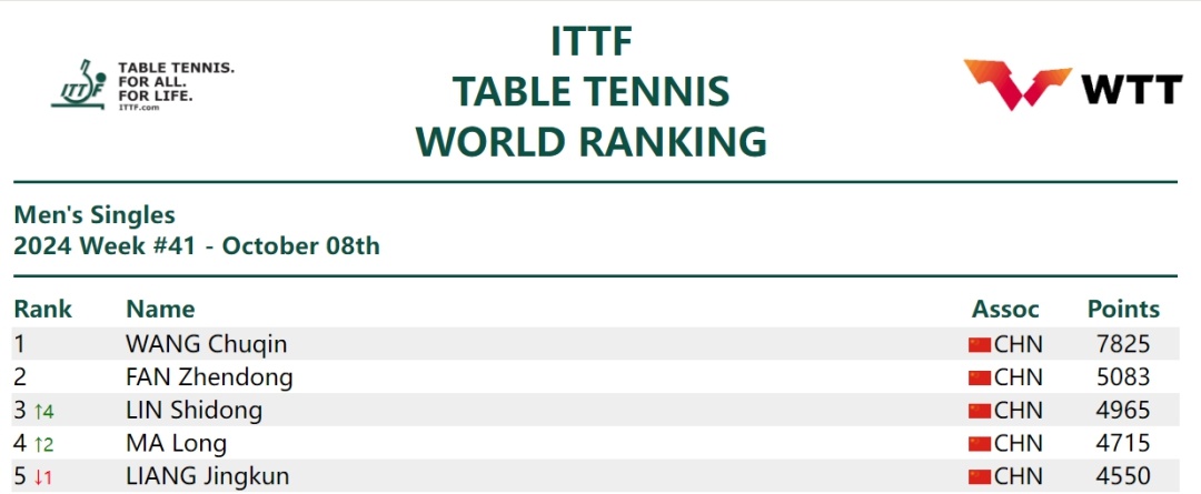 在8日更新的最新一期國際乒聯世界排名中,王楚欽以7825分排名男單首位,本雅明·法拉吉僅位列第210位。