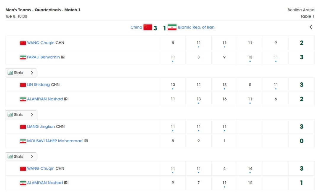 梁靖崑面對的是默罕默德·穆薩維·塔赫爾。他整場比賽占據優勢,以3:0輕松取勝。此后,再次登場的王楚欽找回狀態,以3:1戰勝諾沙德·阿拉米揚。中國隊逆轉取勝,迎來賽事開門紅。