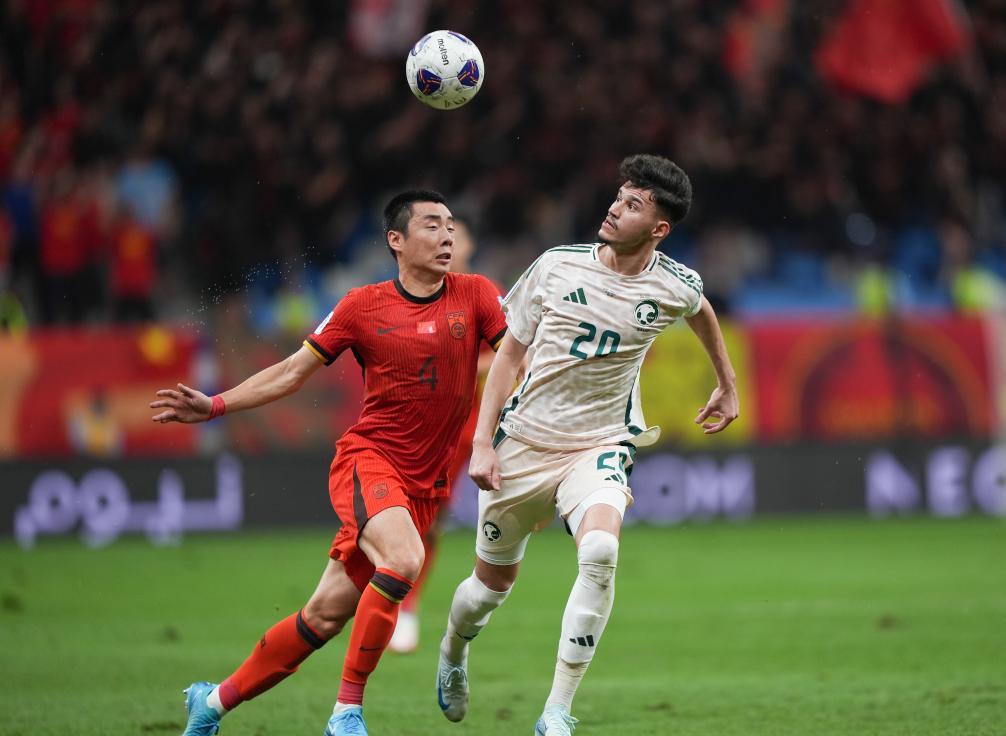 9月10日,在大連舉行的2026年國際足聯世界杯亞洲區預選賽18強賽C組第二輪比賽中,中國隊球員李磊(左)和沙特隊球員哈姆丹拼搶。新華社記者 李鋼 攝