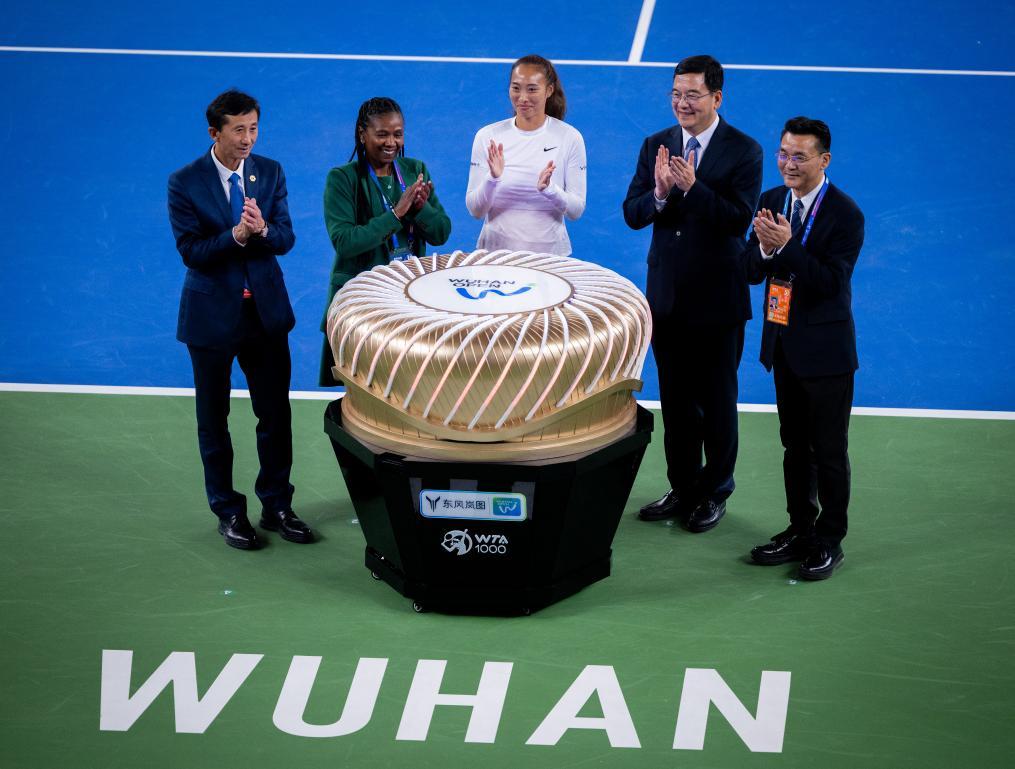 10月7日,2024年WTA武漢網球公開賽開幕儀式在武漢光谷國際網球中心舉行,鄭欽文(中)在開幕儀式上。新華社記者 胡競文 攝