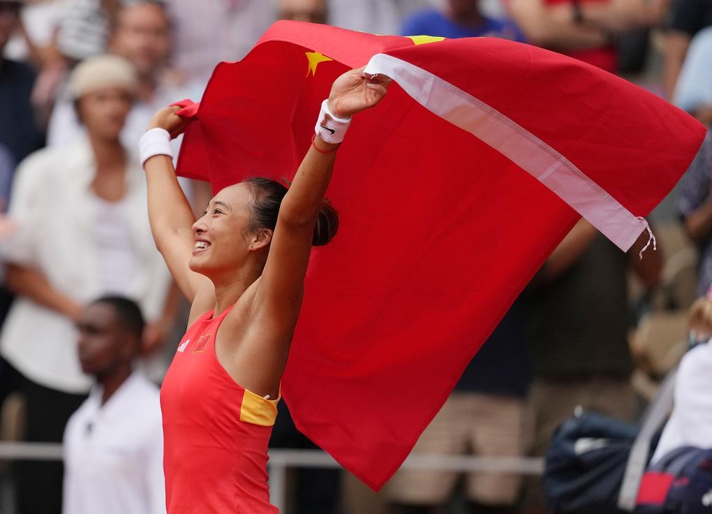 8月3日,在巴黎奧運會網球女子單打金牌賽中,中國選手鄭欽文2:0戰勝克羅地亞選手維基奇,奪得金牌。新華社記者 萬象 攝