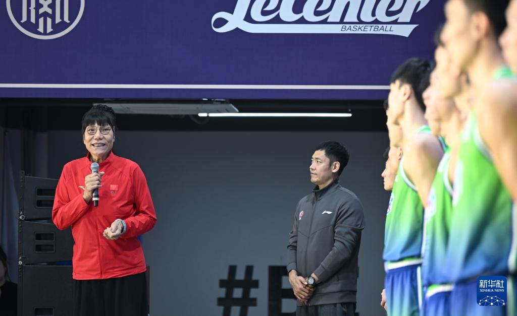 10月9日,前中國女子籃球運動員鄭海霞(左)在出征儀式上向球員寄語。