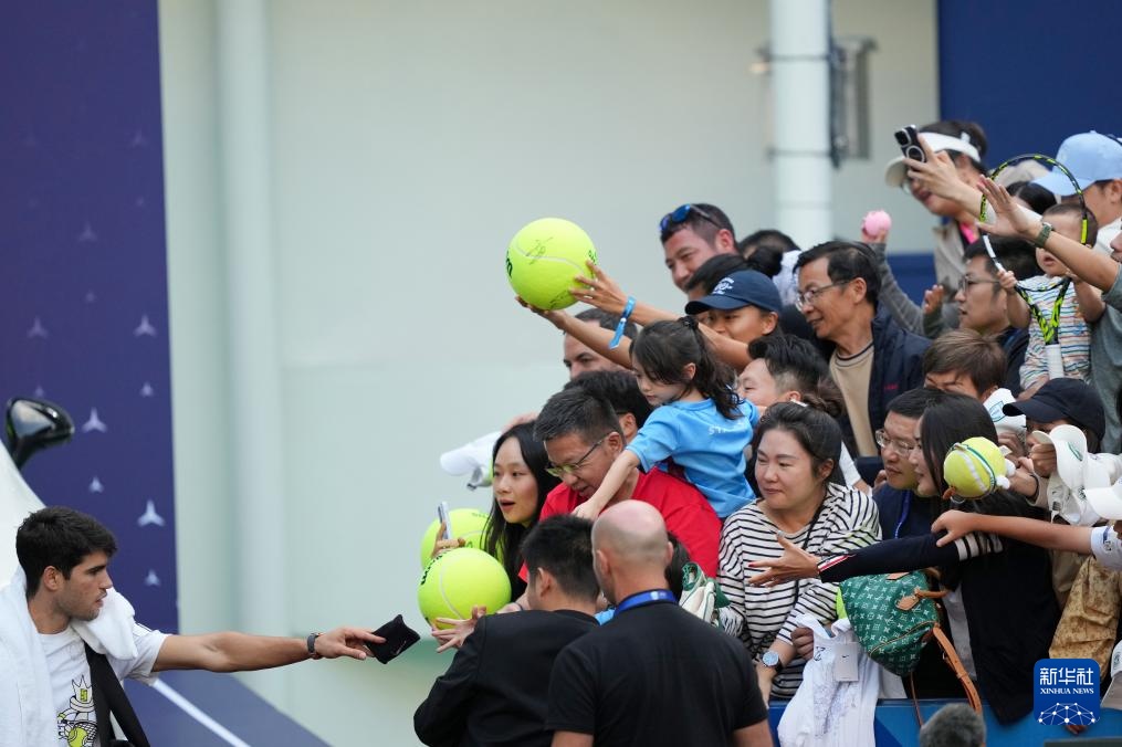 10月9日,阿爾卡拉斯(左下)在比賽后向球迷贈送護腕。