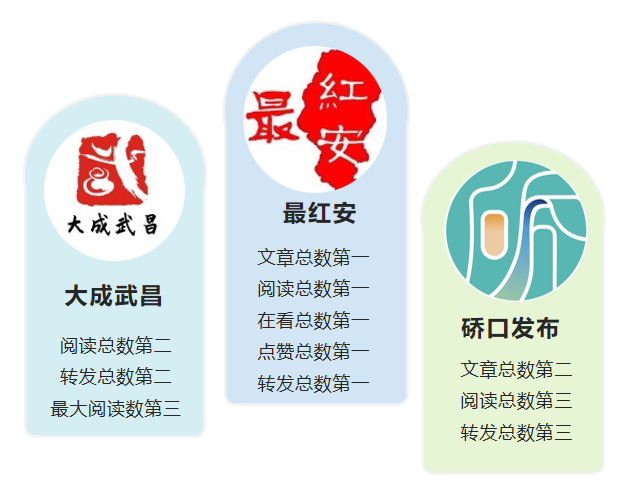 “最紅安”多項(xiàng)指數(shù)位居第一,如文章總數(shù)、閱讀總數(shù)、在看總數(shù)、點(diǎn)贊總數(shù)、轉(zhuǎn)發(fā)總數(shù)等指標(biāo);“大成武昌”以閱讀總數(shù)第二、轉(zhuǎn)發(fā)總數(shù)第二、最大閱讀數(shù)第三排在第二位;“硚口發(fā)布”以文章總數(shù)第二、閱讀總數(shù)第三、轉(zhuǎn)發(fā)總數(shù)第三排在第三名。其他賬號(hào)部分單項(xiàng)指數(shù)亮點(diǎn)突出,“洪山大學(xué)之城”最大閱讀數(shù)排名第一、“枝江發(fā)布”平均閱讀數(shù)排名第一、“大冶發(fā)布”平均點(diǎn)贊數(shù)排名第一。