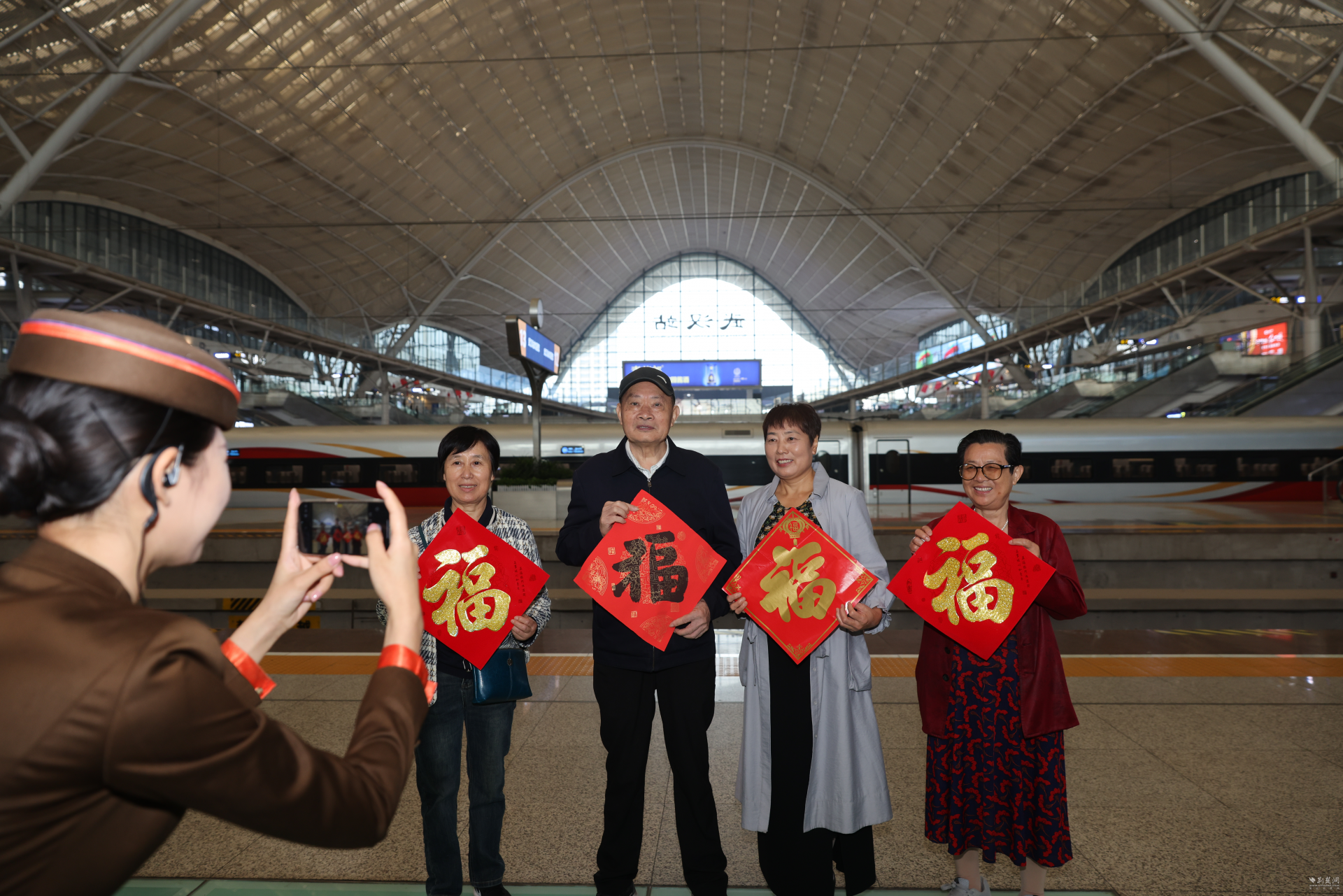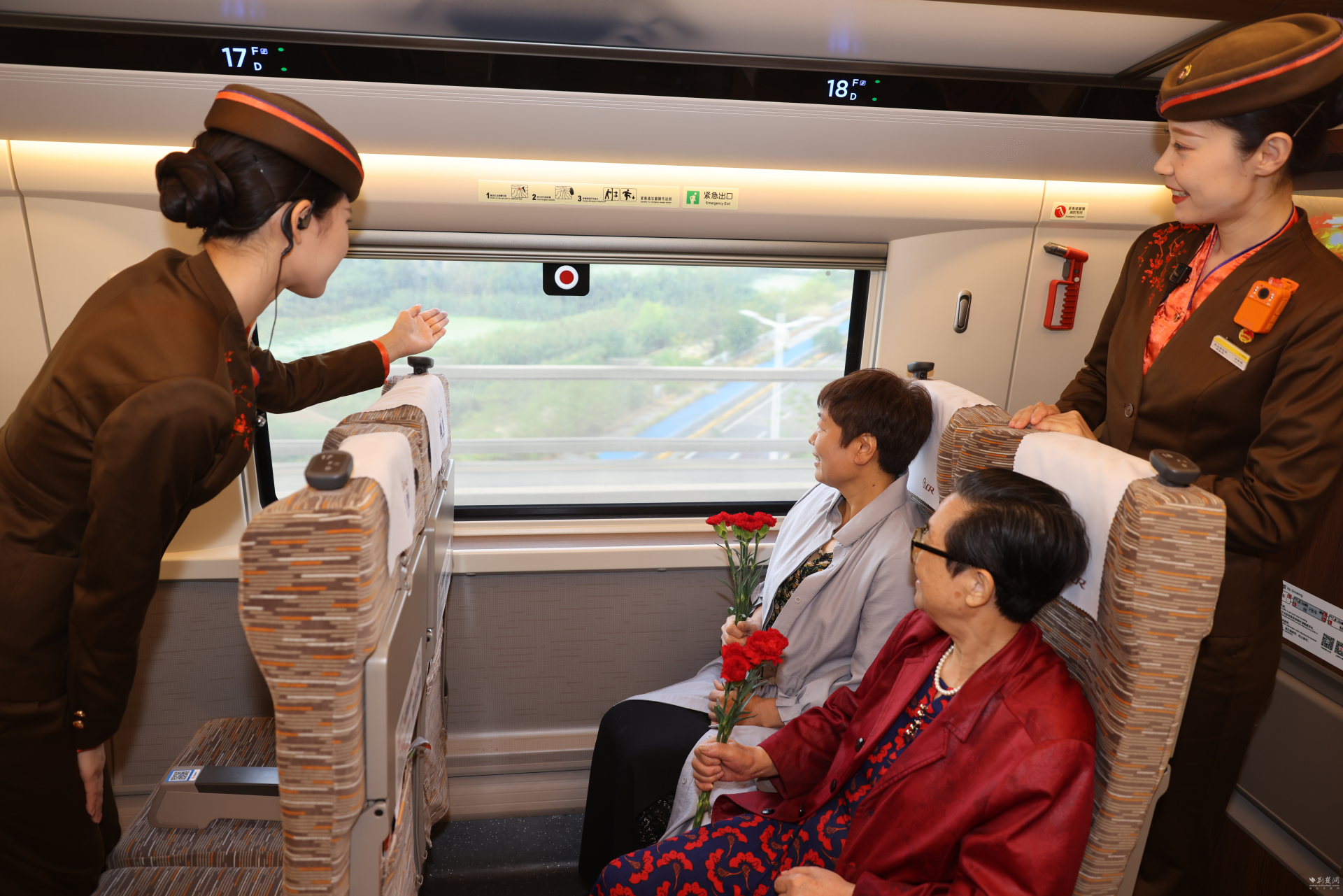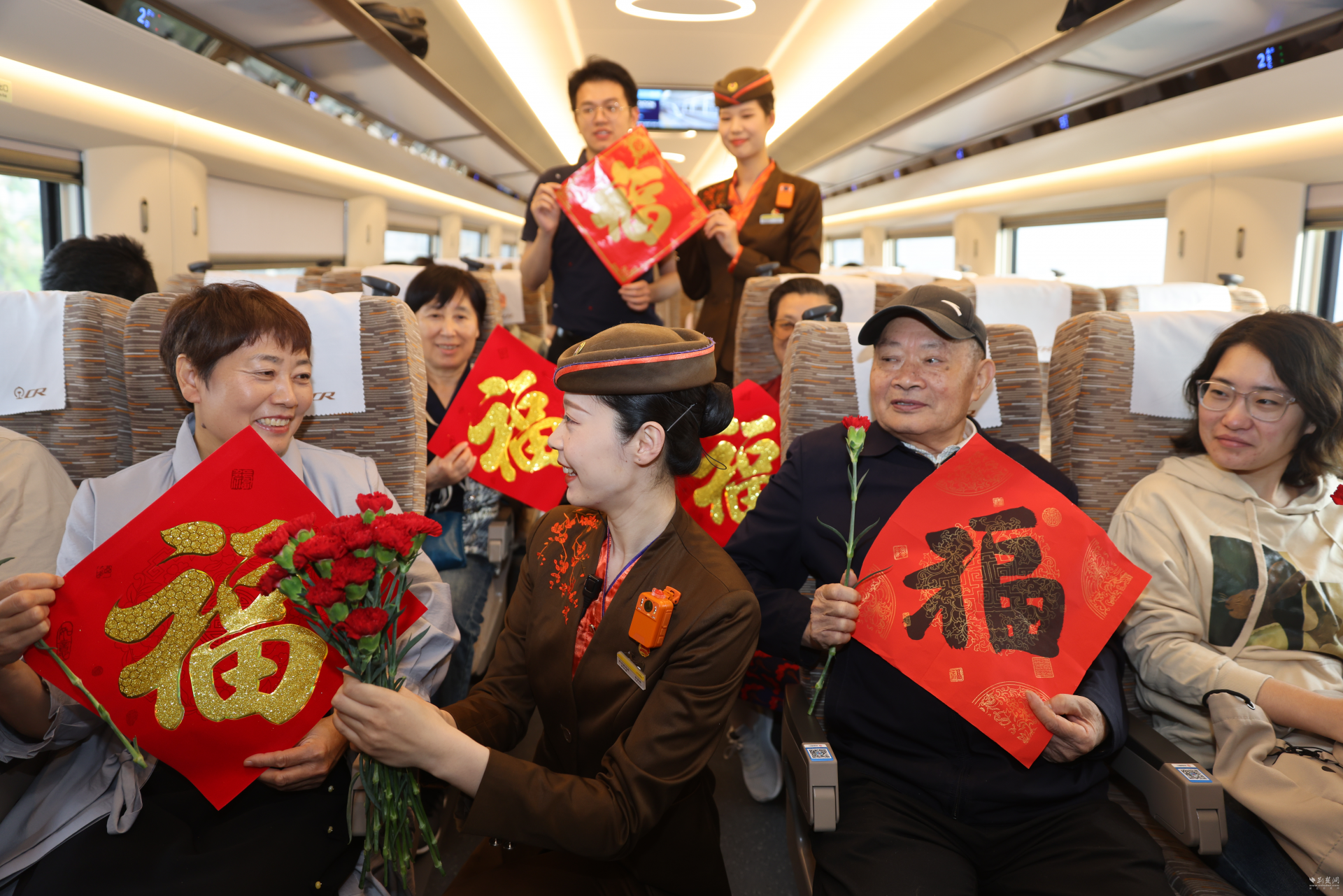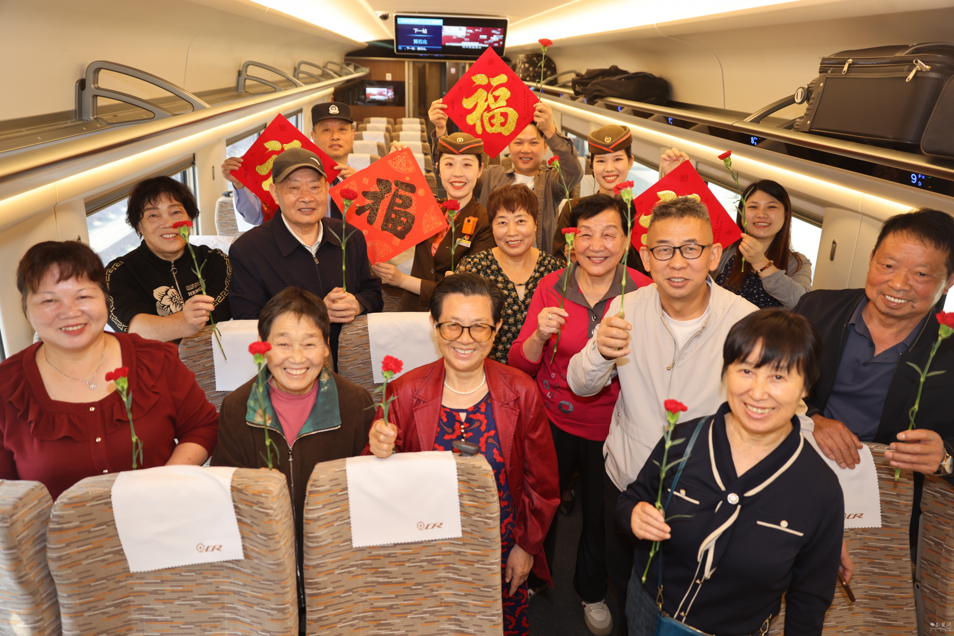 旅途中,乘務(wù)組還擔(dān)當(dāng)導(dǎo)游,為老年旅客講解列車安全知識、乘車須知和沿途風(fēng)景;為旅客打卡留念,在列車上留下燦爛的笑容、美好的回憶。旅客們紛紛表示重陽節(jié)乘坐高鐵,沒想到還有驚喜,并向乘務(wù)組表示感謝。