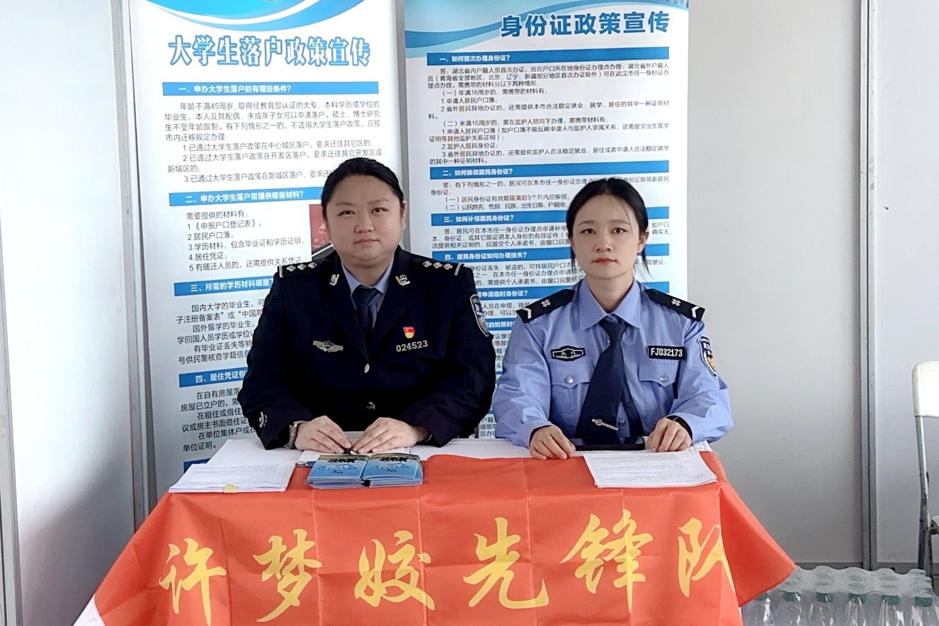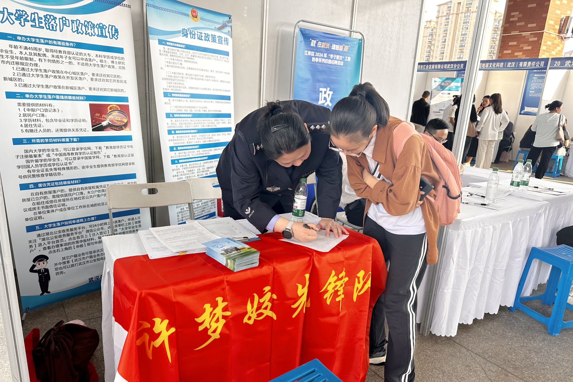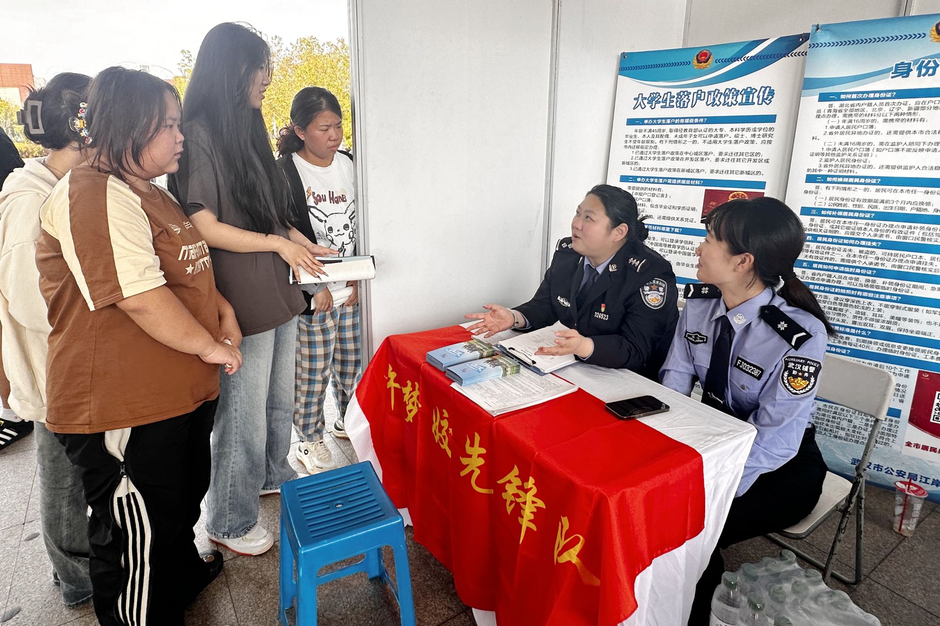 展位上醒目的宣傳標語和色彩鮮艷的宣傳海報吸引著過往同學的目光。武漢江岸民警周晨帶著輔警黃娜、劉子琦向路過學生發(fā)放戶籍業(yè)務(wù)宣傳手冊,讓學子們能夠一目了然地了解到與自己息息相關(guān)的戶籍知識。