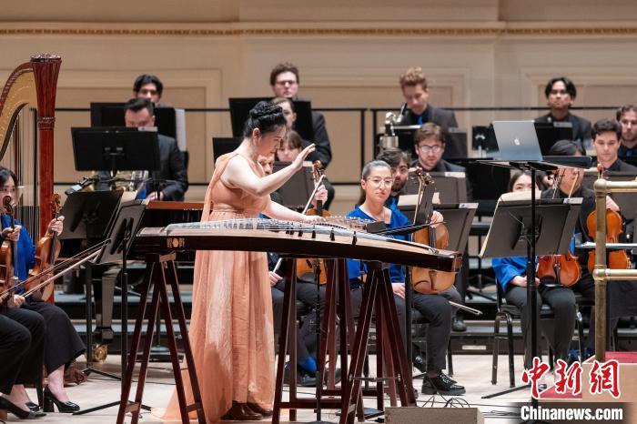 當地時間10月12日,第七屆紐約中國當代音樂節在紐約卡內基音樂廳開幕。圖為古箏演奏家夏菁與人工智能在舞臺上隔空協作,演繹孫宇明作曲的《繁星散落的夜晚》。 中新社記者 王帆 攝