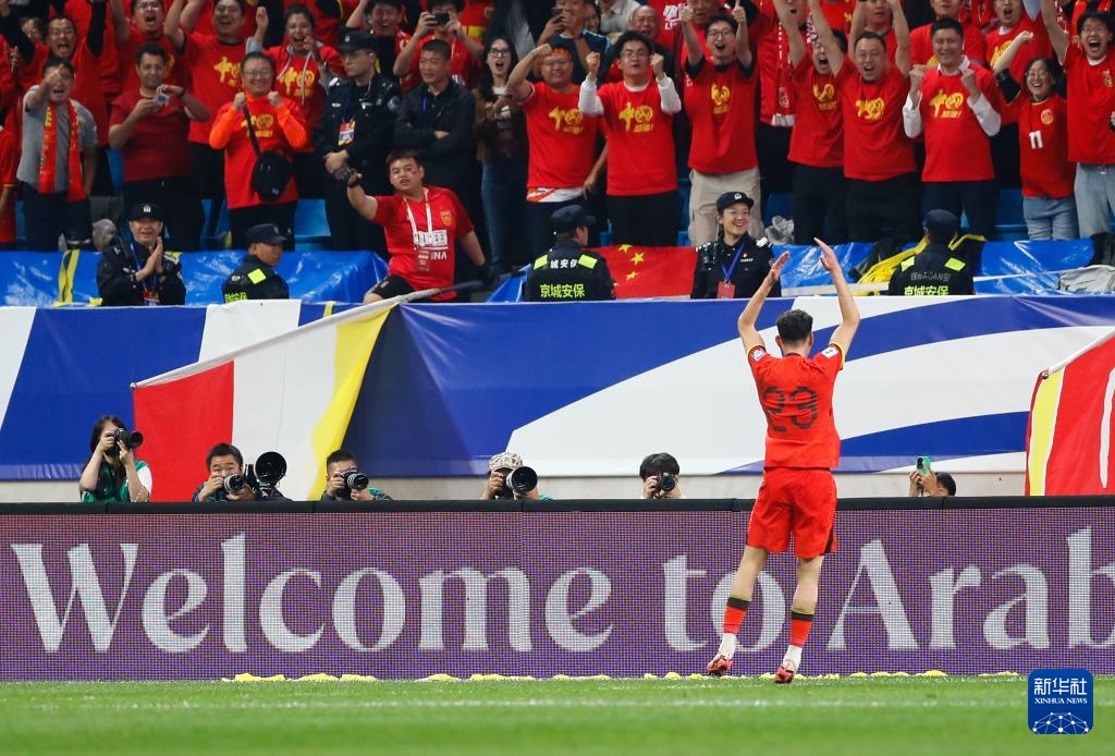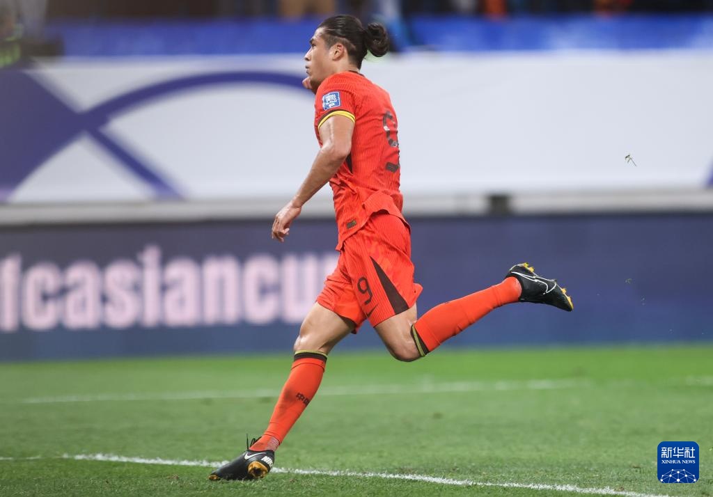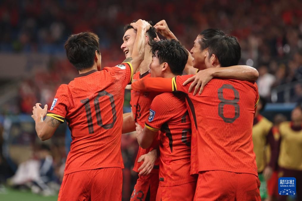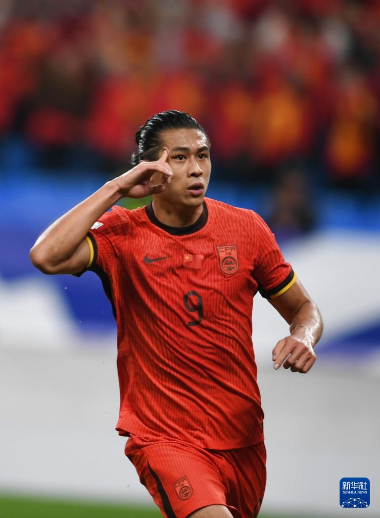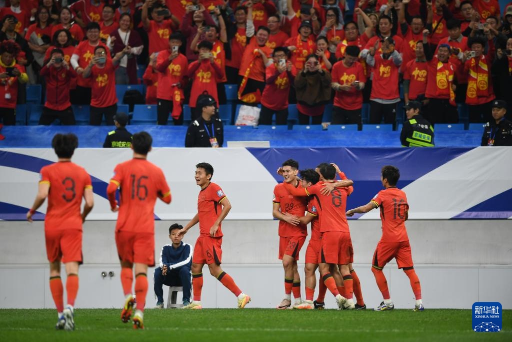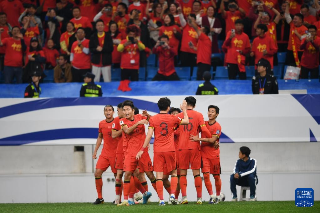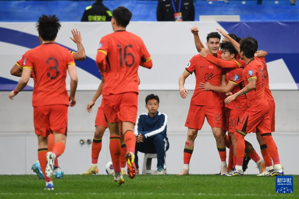 10月15日,中國隊球員張玉寧(右一)慶祝進球。