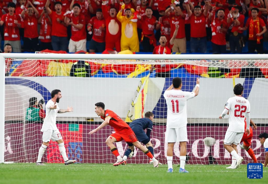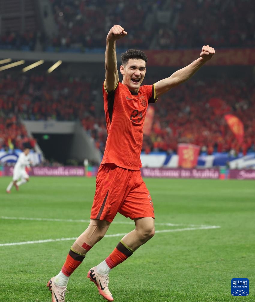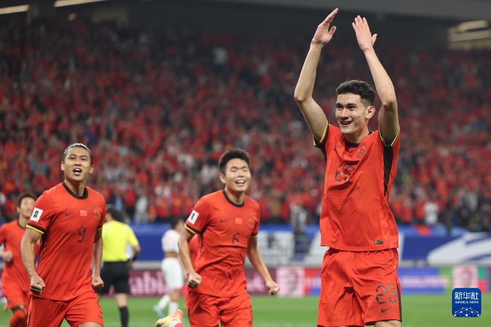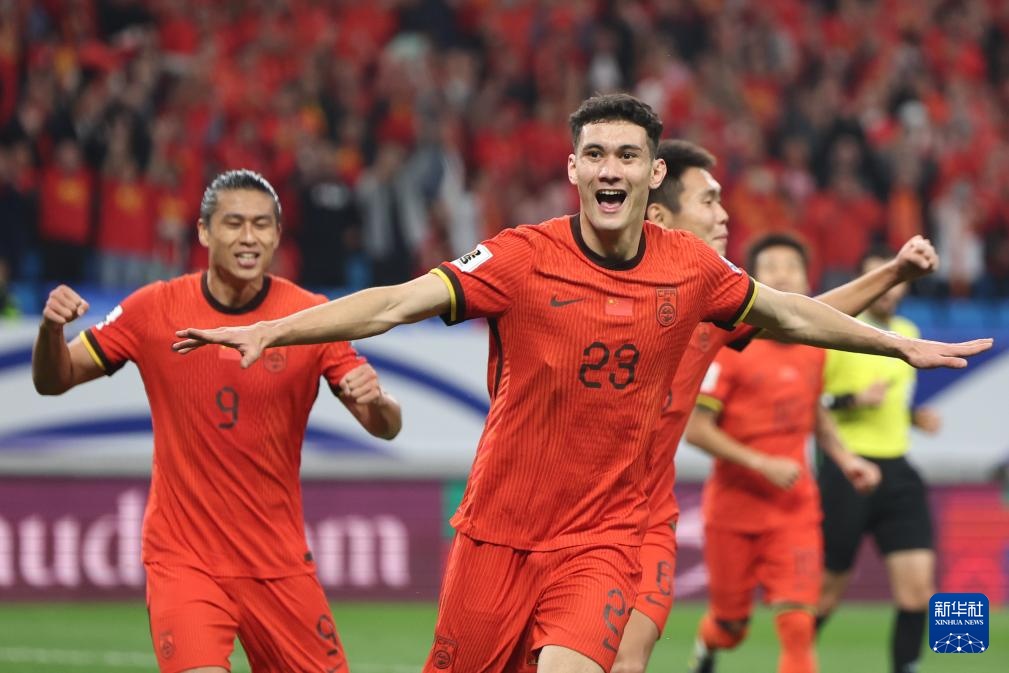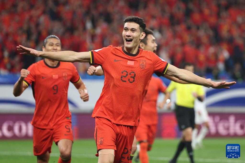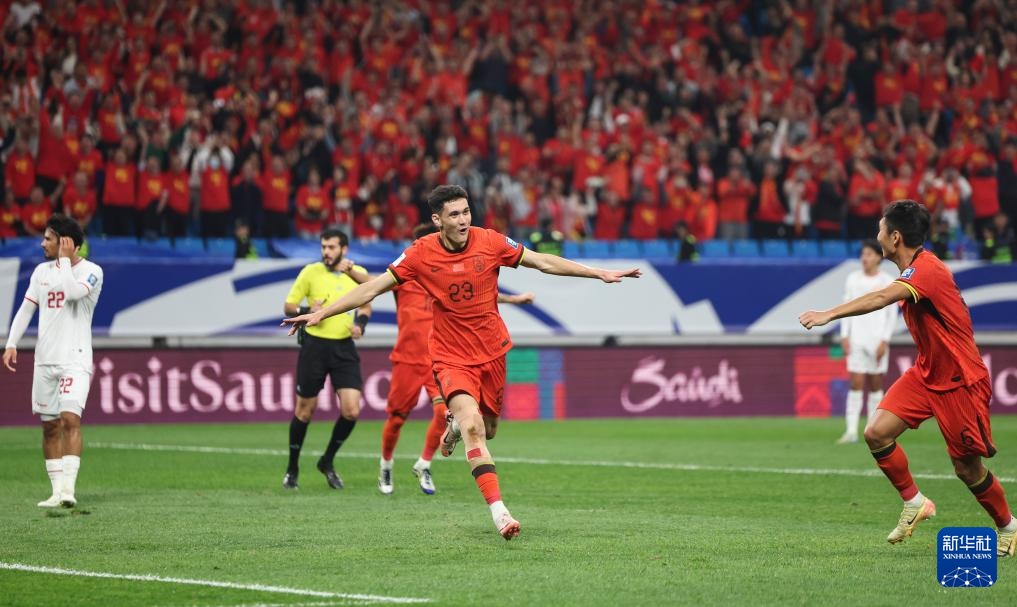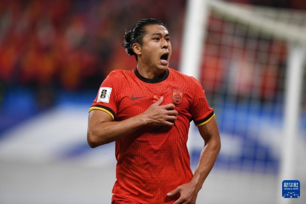 10月15日,中國隊球員張玉寧(右一)慶祝進球。