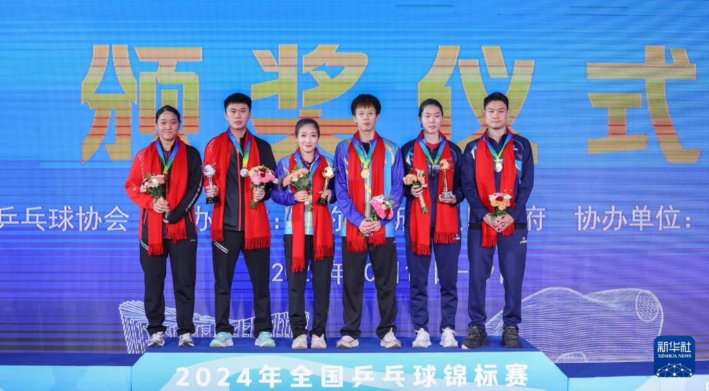10月15日,冠軍廣東隊組合林高遠(右三)/劉詩雯(左三)、亞軍上海地產集團隊組合趙釗彥(左二)/孫銘陽(左一)、季軍山東隊組合劉丁碩/孫藝禎(右二)在頒獎儀式上。