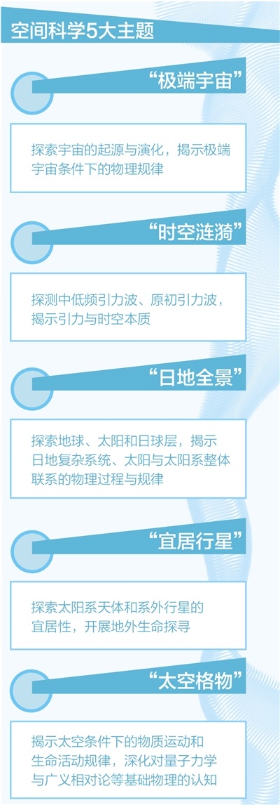 “太空格物”主題。主要是揭示太空條件下的物質(zhì)運(yùn)動(dòng)和生命活動(dòng)規(guī)律,深化對(duì)量子力學(xué)與廣義相對(duì)論等基礎(chǔ)物理的認(rèn)知。優(yōu)先發(fā)展方向包括微重力科學(xué)、量子力學(xué)與廣義相對(duì)論、空間生命科學(xué)等。