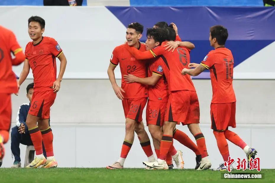 國足在第一個進球后慶祝。中新社記者 富田 攝