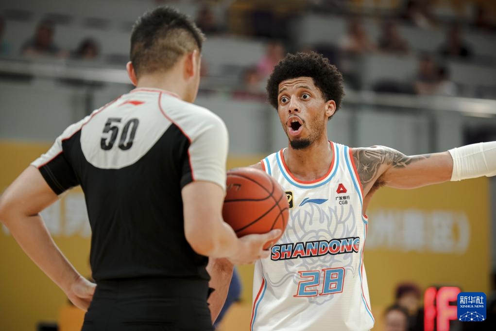 10月17日,山東高速隊球員威金頓(右)對主裁判楊曉光的判罰提出異議。
