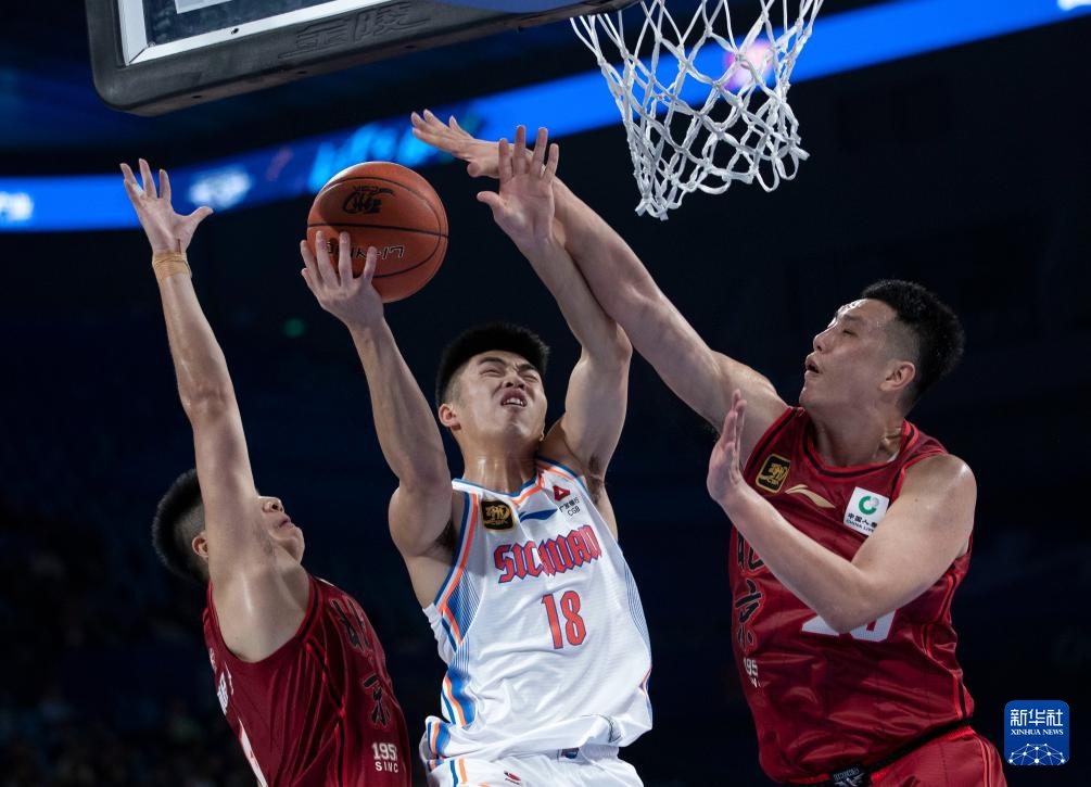 10月17日,四川豐谷酒業隊球員于梟永(中)在比賽中上籃。