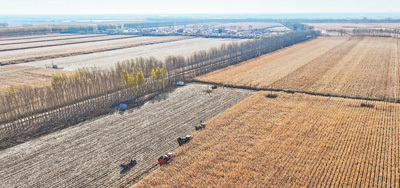 圖為10月16日黑龍江省肇東市東升村,農(nóng)機(jī)在收獲玉米。 新華社記者 謝劍飛攝 |