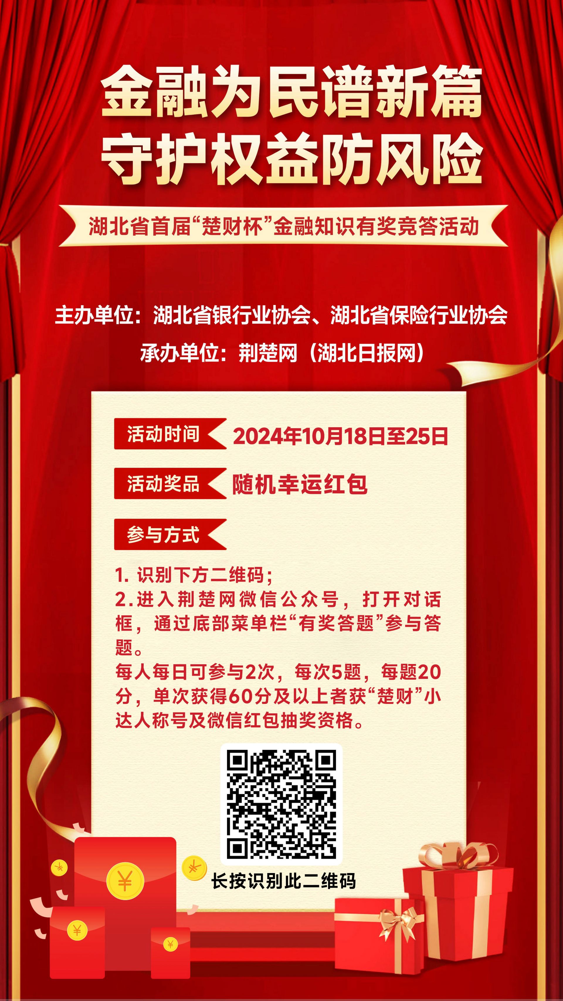 荊楚網(湖北日報網)訊(記者金計)隨著全球金融市場的快速發展,金融知識的普及變得尤為重要。為深入貫徹落實黨的二十大、二十屆三中全會精神和中央金融工作會議部署,不斷踐行金融工作政治性、人民性,切實提升社會公眾金融素養及風險防范能力,營造和諧健康金融環境,湖北省銀行業協會、湖北省保險行業協會、湖北日報傳媒集團聯合啟動湖北省首屆“楚財杯”金融知識有獎競答活動,旨在通過答題的形式,向公眾傳授基礎金融知識,幫助廣大金融消費者知金融、學金融、懂金融、用金融,讓金融知識惠及千家萬戶。